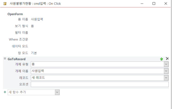 2. <사원별평가현황>폼의 ‘cmd입력’을 클릭하면 다음과 같은 기능을 수행하도록 매크로를 구현하시오.(5점)